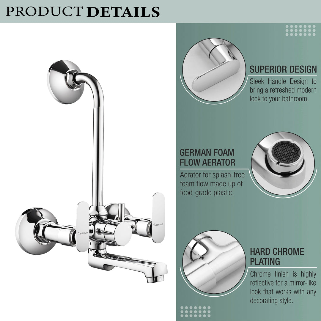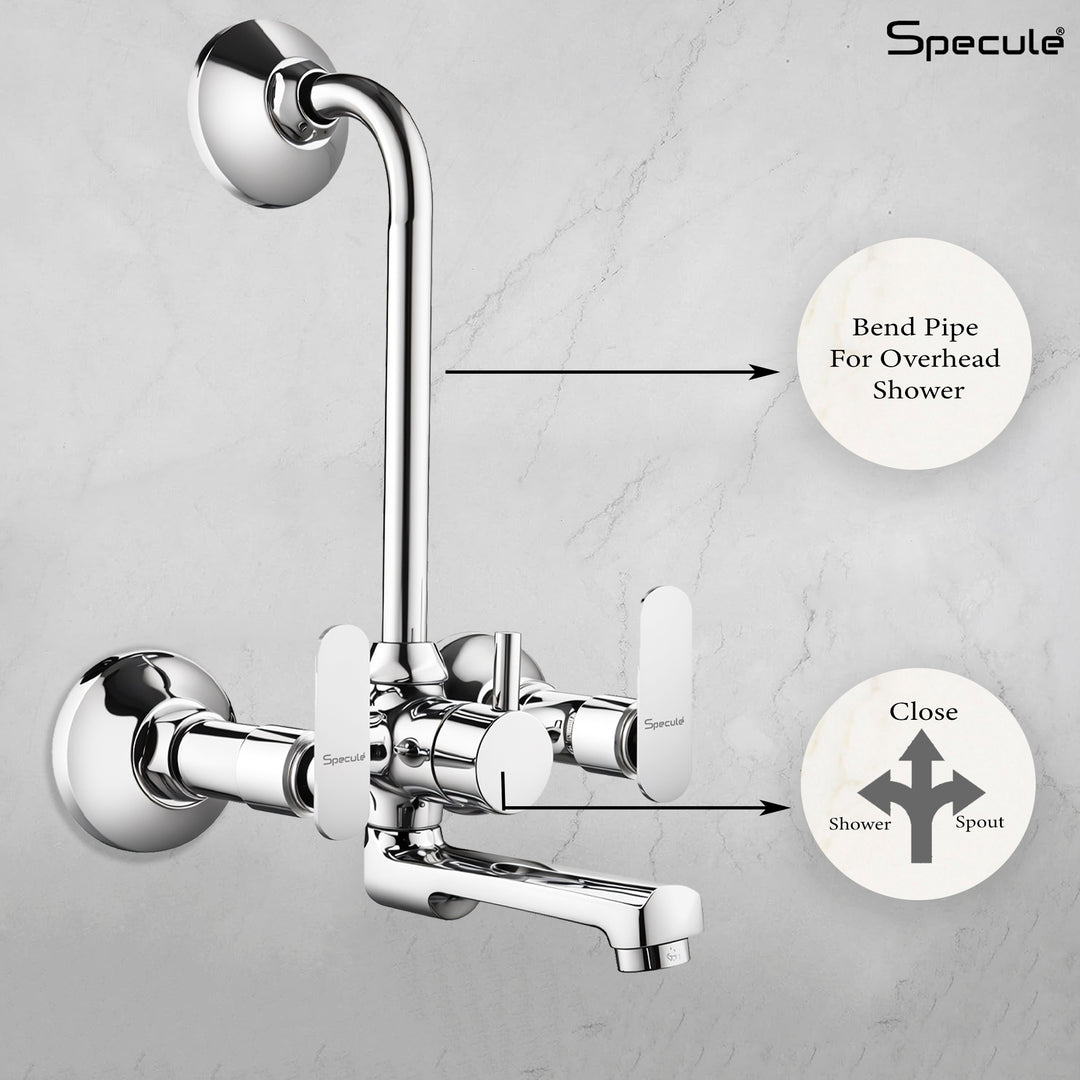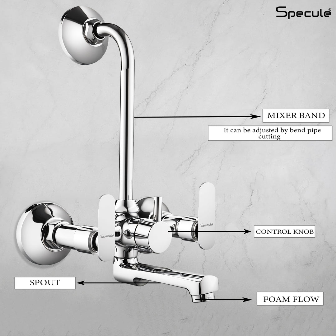 Specule Wall Mixer with L Bend Brass Faucet allows you to mix hot and cold water using separate levers/handles and the L bend allows easy attachment of overhead shower that can be controlled by the central lever/handle. Material & Finish