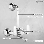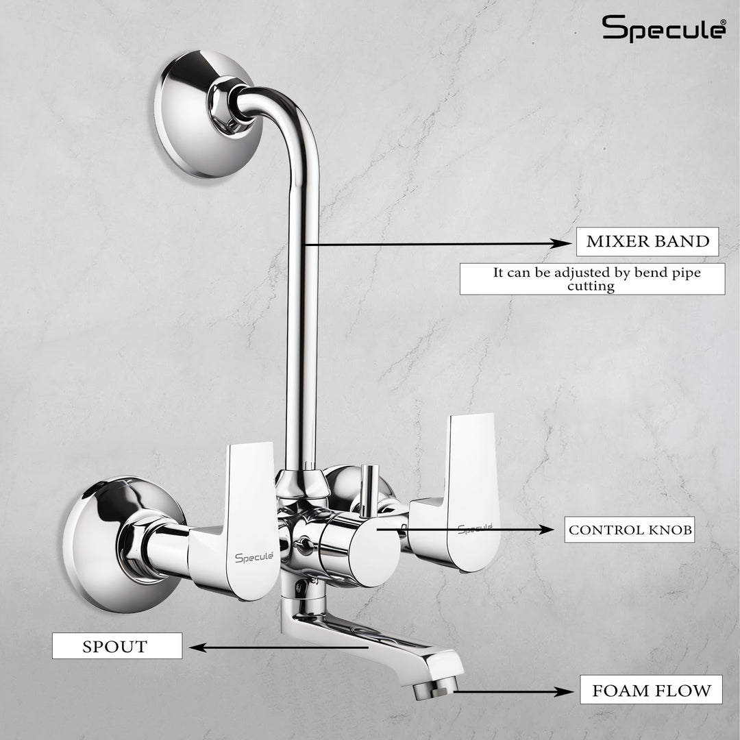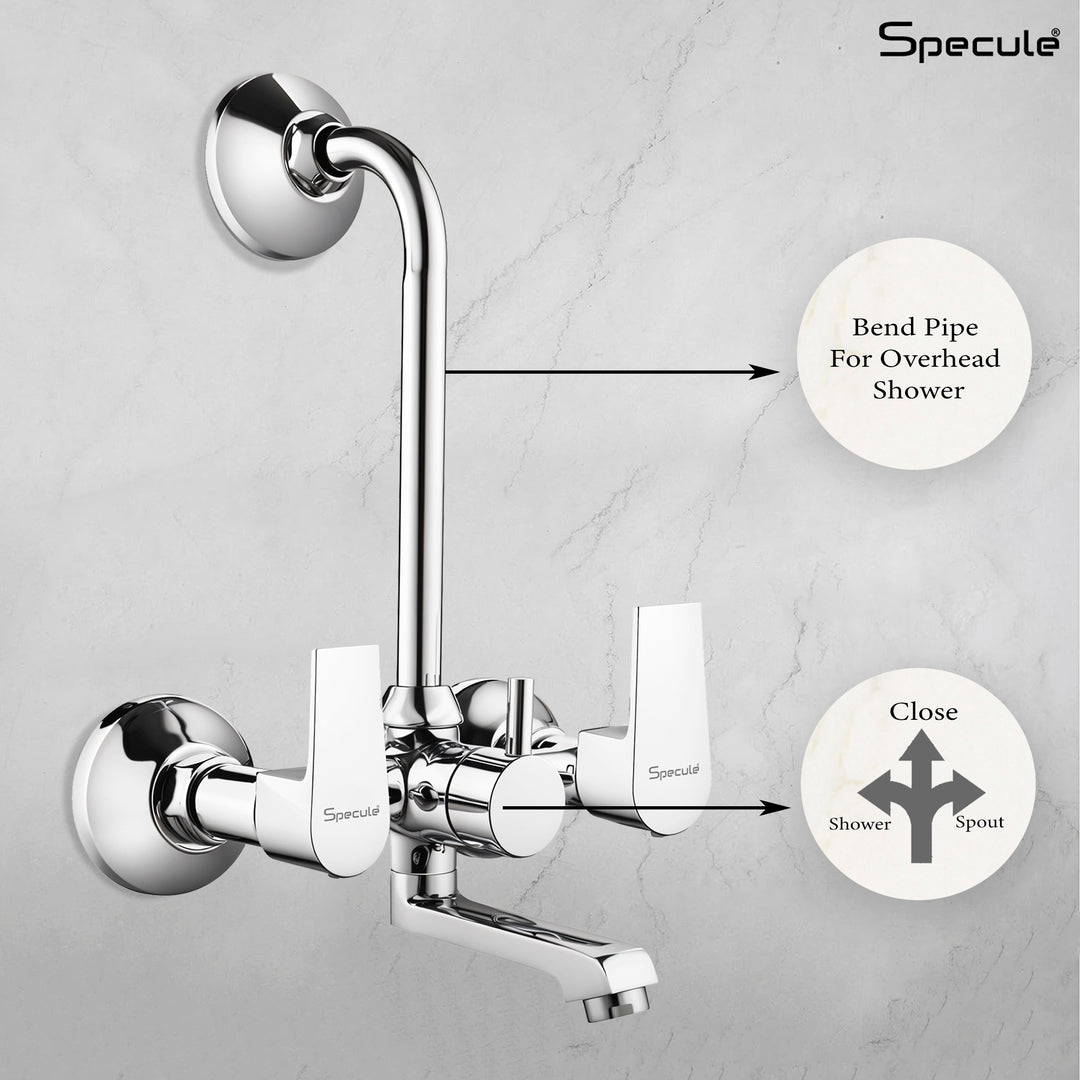 Specule Wall Mixer with L Bend Brass Faucet allows you to mix hot and cold water using separate levers/handles and the L bend allows easy attachment of overhead shower that can be controlled by the central lever/handle. Material & Finish